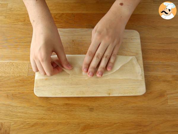 Asezati o lingura de mere la capatul foii de brick si impaturiti astfel incat sa iasa un triunghi.