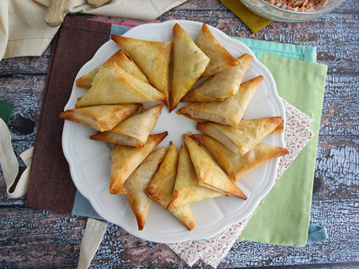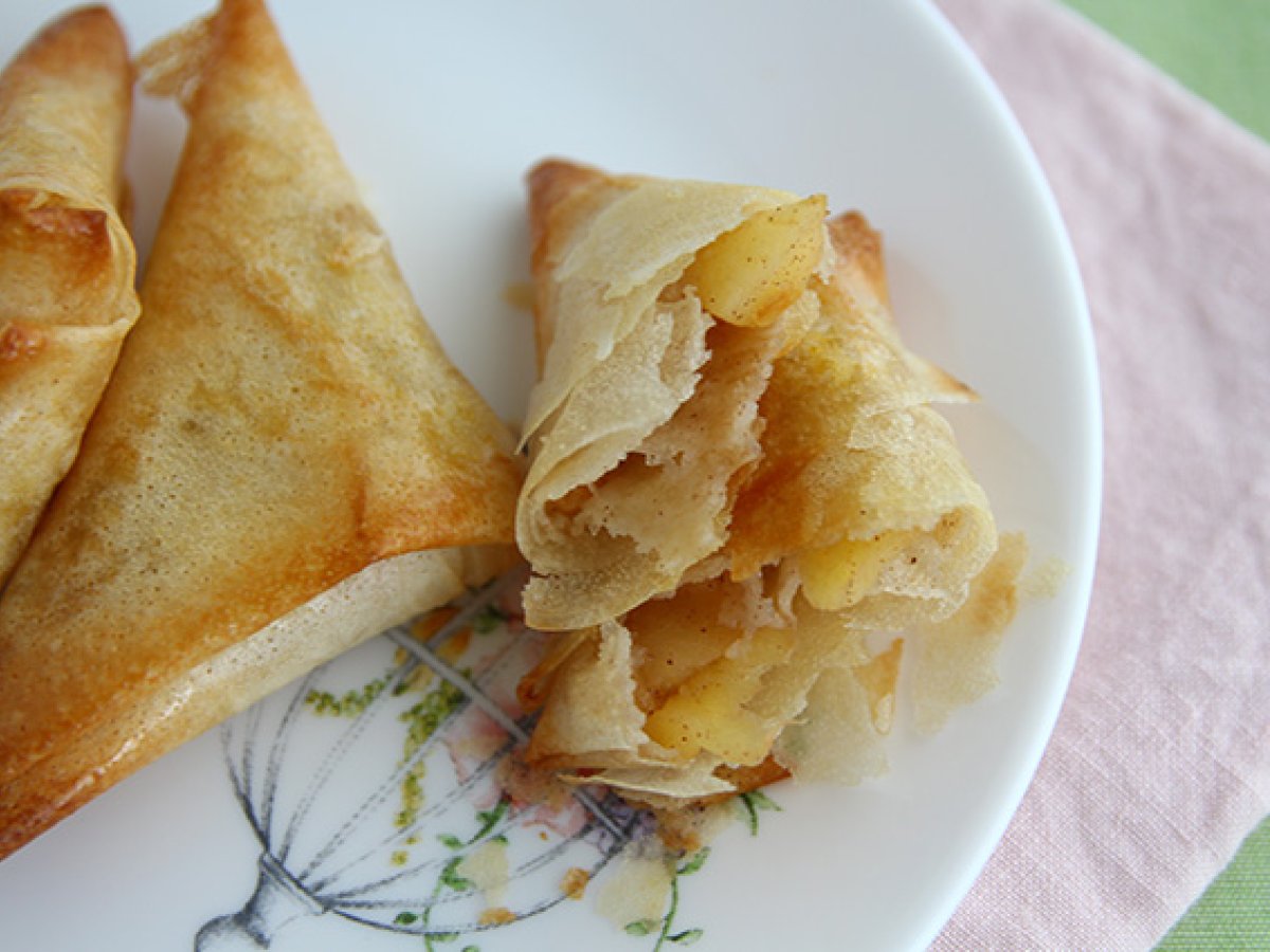 Pentru o gustare inedita, bucurati-va de aceste samosas cu mere si scortisoara! Sunt foarte usor de facut, cu umpluturi diferite, iar tehnica de pliere a acestui triunghi este disponibila in video. Faceti combinatii sarate sau dulci.