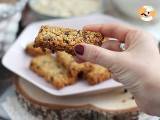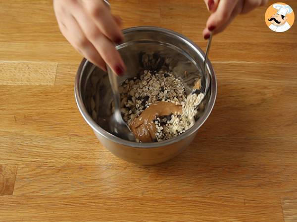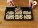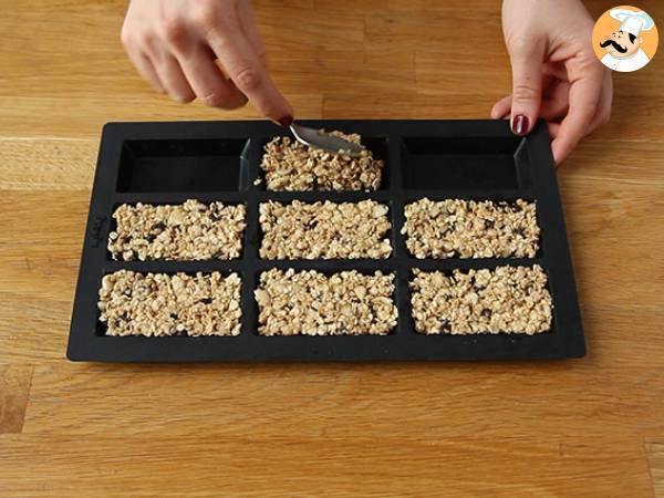 Puneți amestecul în formele pentru batoane de granola (sau pe fundul unei tăvi de copt tapetată cu hârtie de copt).