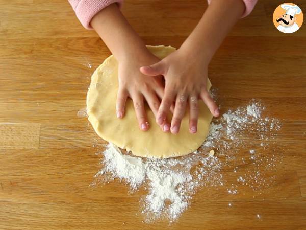 Puneti faina pe suprafata de lucru, apoi ruleaza aluatul cu un sucitor. Cu un taietor rotund de fursecuri, taiati cercuri cu diametrul de 7 cm si asezati-le pe o tava acoperita cu hartie pergament.