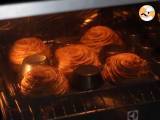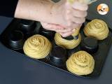 Întoarceți tava pentru brioșe cu susul în jos și ungeți-i suprafața. Așezați aluatul peste fundul formelor de brioșă, formând o spirală continuă. Apăsați bine părțile care nu s-au lipit împreună. Ungeți cu ulei vegetal bolurile din churro.
