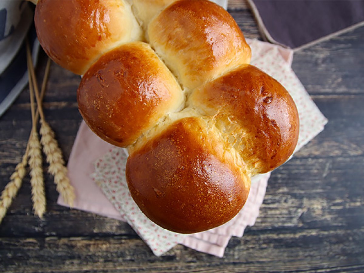 Preincalziti cuptorul la 160° C si puneti in interior un recipient care contine apa. Ungeti briosa cu ou batut si dati la cuptor pentru 25 de minute la 160° C.