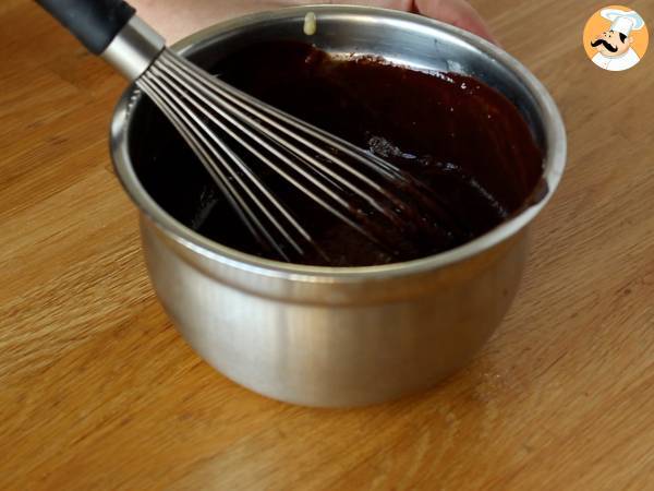 Topiți ciocolata și untul. Amestecați ouăle cu zahărul brun. Se încorporează faina, apoi amestecul de ciocolata + untul topit.