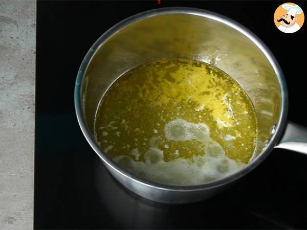 Puneti apa, untul si zaharul intr-o cratita pe foc. Cand untul se topeste si amestecul incepe sa fiarba, adaugati faina dintr-o data.