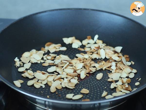 Puneti migdalele fulgi intr-o tigaie pe foc si amestecati ocazional timp de aproximativ 5 minute. Luati de pe foc si lasati sa se raceasca.