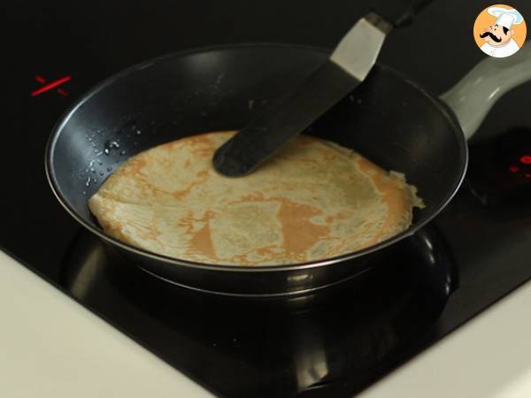 Întoarceti clatita atunci cand aluatul se ridica de pe margini, folosind o spatula sau saltand clatita! Rumeniti clatita pe partea cealalta si reluati procedeul!