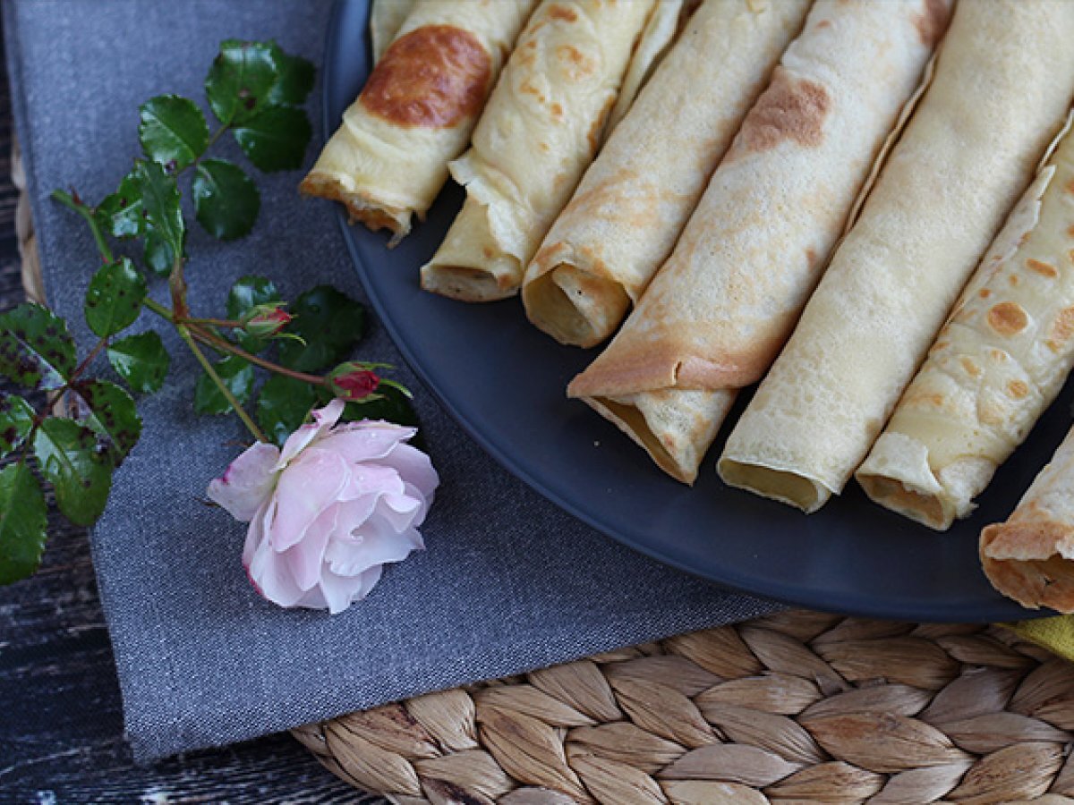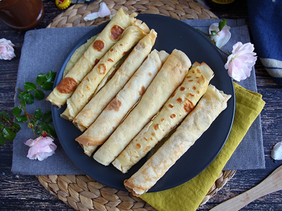 Încalziti tigaia apoi ungeti fundul acesteia cu un prosop de hartie inmuiat in ulei vegetal. Se toarna o jumatate de polonic de aluat si se distribuie bine aluatul, miscand tigaia.