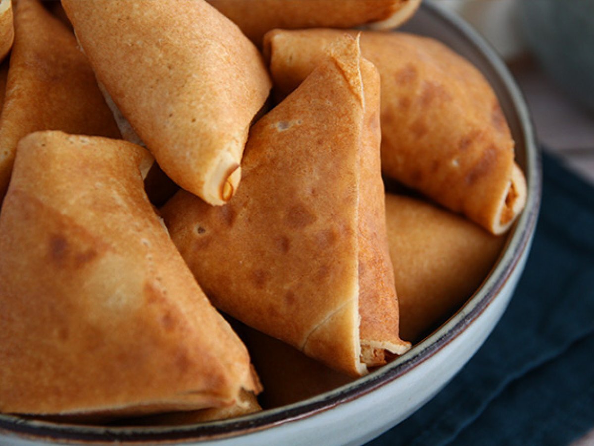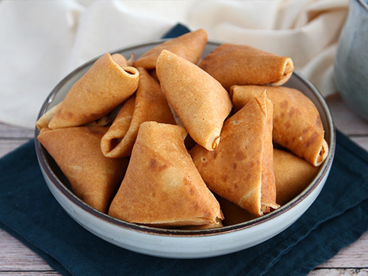 Reinterpretati clatitele si prezentati-le sub forma de samosas dulci, insotite de mere + caramel ;-) Simtiti-va liberi sa modificati toppingurile pentru a oferi samosas cu arome diferite!
