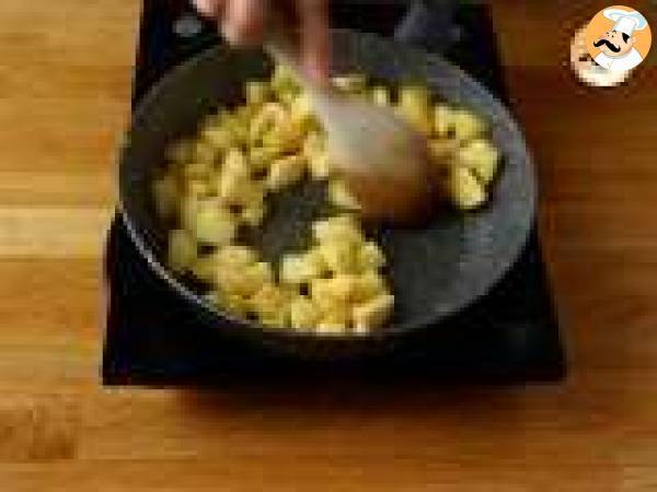 Curățați și tăiați merele în bucăți mici. Apoi rumeniți-le într-o tigaie, la foc mediu timp de 10 minute, amestecând din când în când.