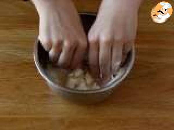 Între timp, pregătiți crumble-ul: amestecați făina, migdalele măcinate și zahărul. Adăugati untul rece, tăiat bucățele mici si frământați cu degetele pentru a forma crumble.