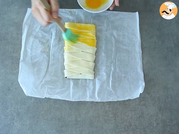Taiati celelalte doua capete de aluat la capetele tabletei. Indepartati resturile. Indoiți benzile spre centru, suprapunandu-le de la stanga la dreapta. Ungeti cu galbenus folosindu-va de o pensula.