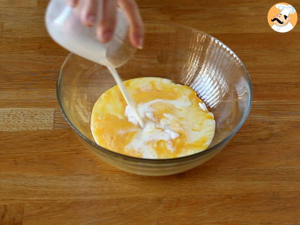 Într-un castron mare, combinați ouăle, zahărul, zahărul vanilat și laptele.