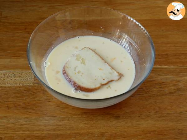 Scufundați feliile de brioșă/pâine în amestecul anterior și lăsați-le la înmuiat. (*vedeți observațiile)