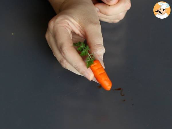 Puteți face morcovii cu pastă de zahăr, sau folosiți morcovi adevărați (baby morcovi), care vor fi folosiți doar pentru decorarea desertului.