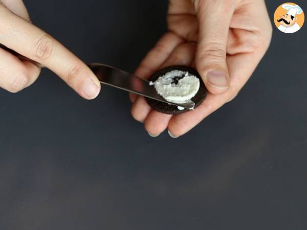 Umpleți golurile fursecurilor cu ganache și dați la rece timp de 15 minute. Acoperiți apoi cu Oreo zdrobit.