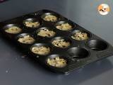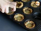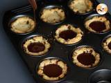 Ungeți o formă de brioșe și umpleți cavitățile cu aluatul de fursecuri realizat anterior. Scobiți centrul aluatului cu o lingură. Coaceți în cuptorul preîncălzit la 200°C timp de 12 minute.