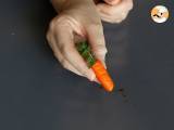 Încorporați vopseaua în marțipan și formați bile mici pe care va trebui să le rulați pentru a face apoi cilindri. Plantați o iarbă la capăt și trasați dungi peste tot pentru a face pliurile morcovului.