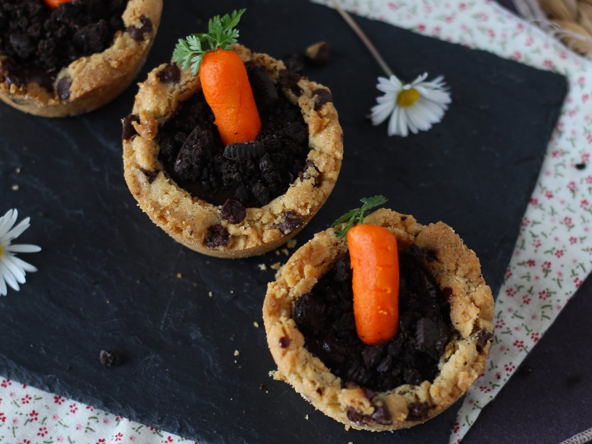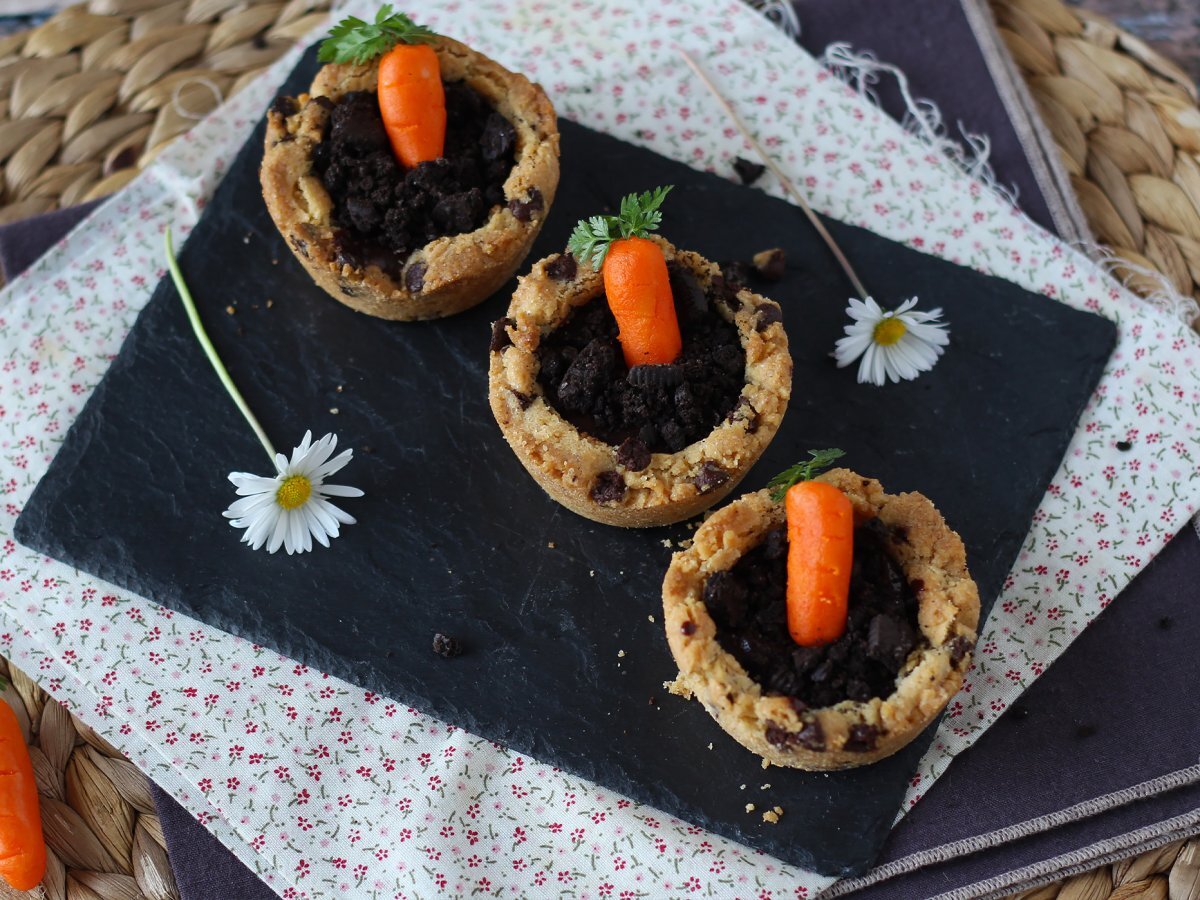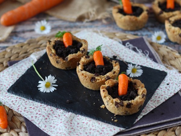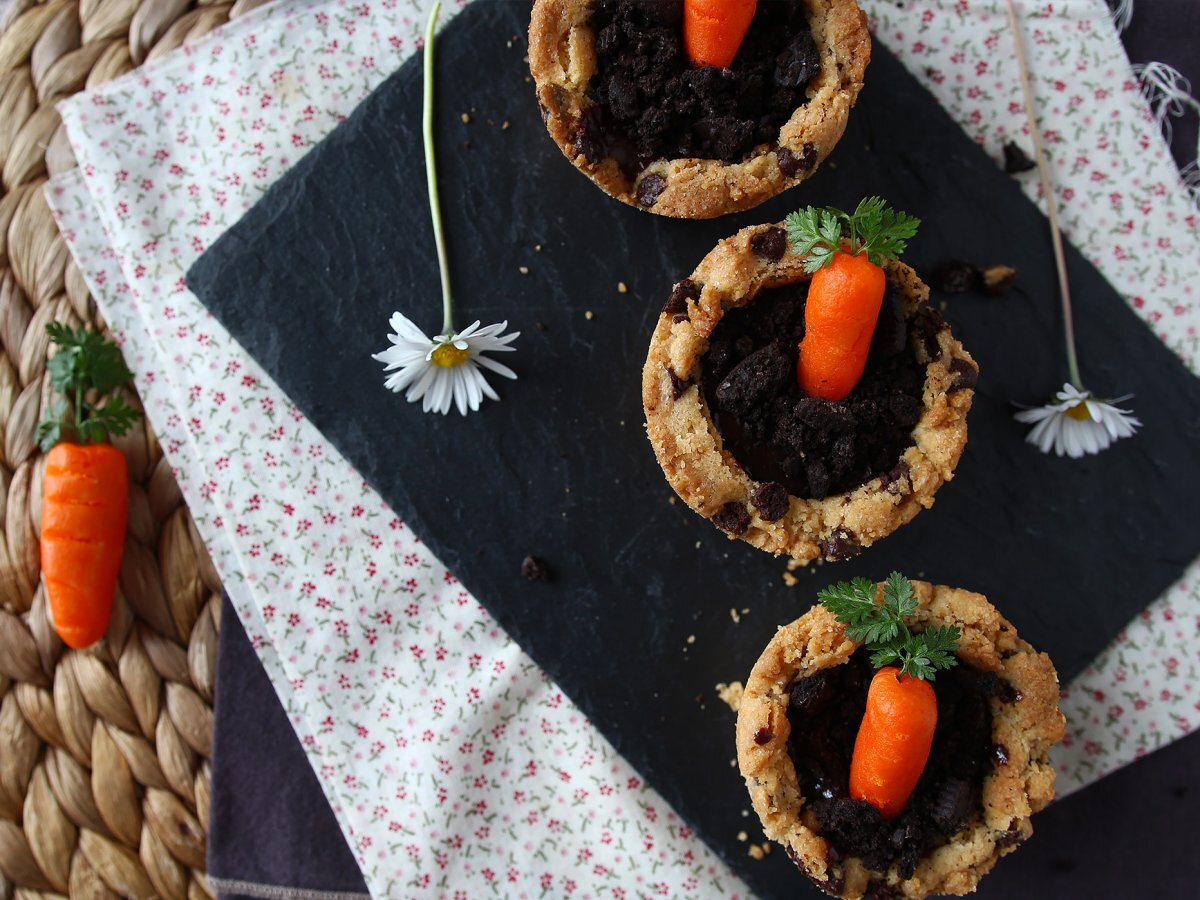 O rețetă nouă din categoria rețetelor de Paște! Descoperiți adorabilele noastre cupe de prăjituri în formă ghivece de legume umplute cu morcovi delicioși de marțipan! Pentru ca aceste fursecuri să creeze și mai multă dependență, le-am umplut cu ganache de ciocolată și biscuiți de ciocolată presărați deasupra pentru a da un efect de „pământ”. Aceste mici delicatese vor fi perfecte de făcut împreună cu copiii în weekend-ul înainte de Paște Deci, să începem.