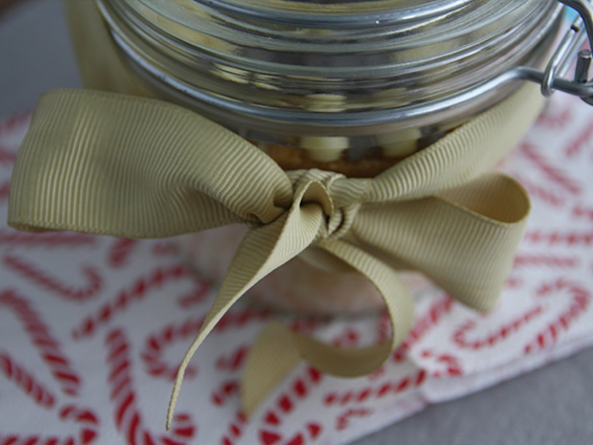 Inconjurati borcanul inchis cu panglica si legati-o impreuna cu patratul cu instructiuni formand un nod mare. Oferiti borcanul :-)