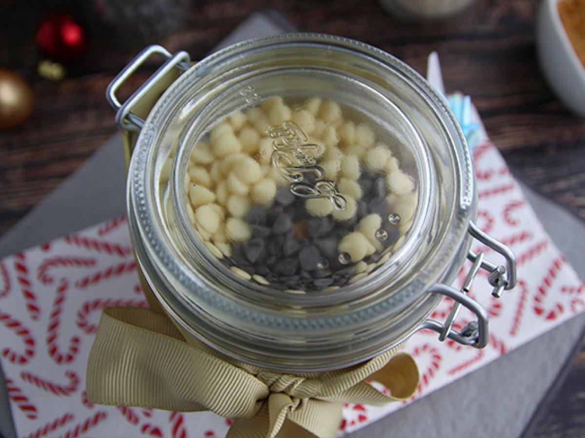 Deschideti borcanul si turnati orezul rotund. Adaugati zaharul brun si umpleti restul borcanului cu pepite de ciocolata alb-neagra. Inchideti borcanul.