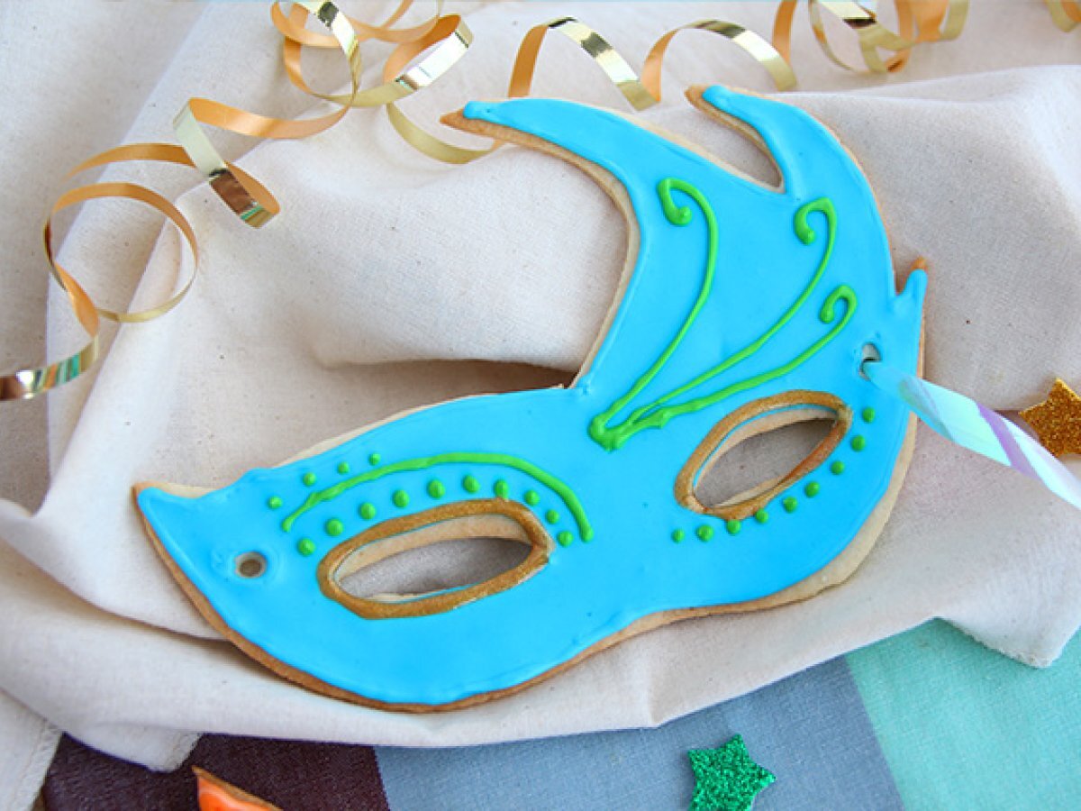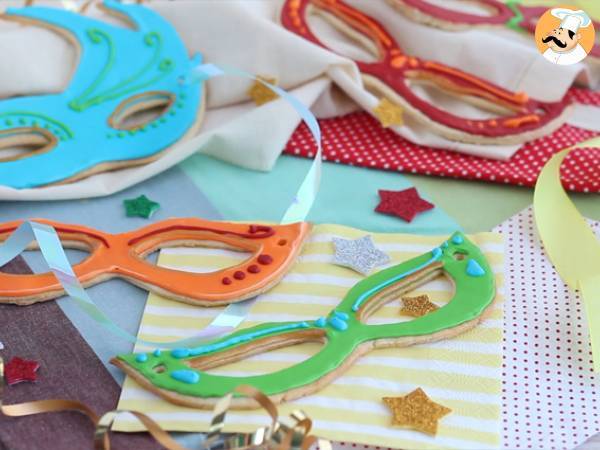 Preincalziti cuptorul la 180° C. Desfaceti aluatul si taiati formele de masti. Reutilizati resturile: formati o minge de aluat si intindeti-o pentru a taia noi forme de masti.