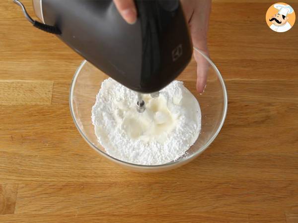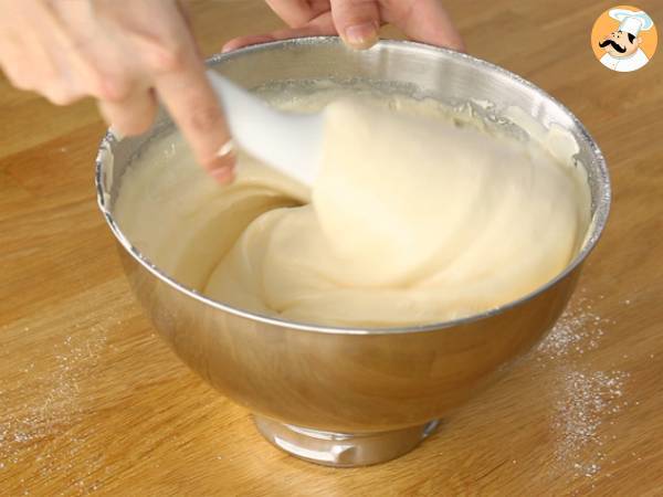 Adaugati faina peste oua si amestecati usor fara sa distrugeti amestecul aerat al oualor. Amestecati bine in partea de jos, deoarece faina se aduna acolo.
