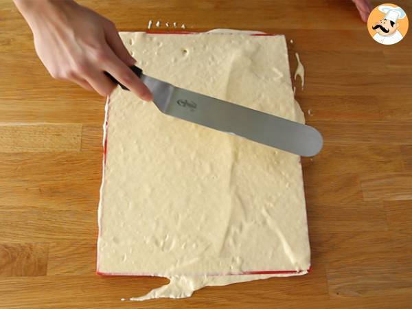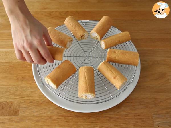 Rulati blatul fara sa il strangeti, astfel incat crema sa nu iasa si puneti rulourile obtinute pe un suport, care este plasat pe un recipient de scurs.