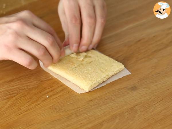 Imediat dupa coacere, scoateti blatul si tăiați marginile. Taiati dreptunghiul in 9 parti egale. Puneti fiecare bucata pe o bucata mica de hartie de copt si rulati bine.