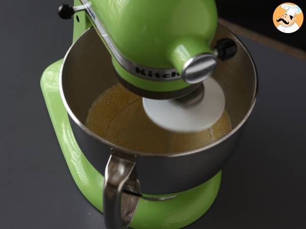 Turnați făina și grisul în vasul mixerului. Amestecați. Adăugați sarea și zahărul într-o parte și acoperiți cu făina + griș inainte de a forma o gropiță.