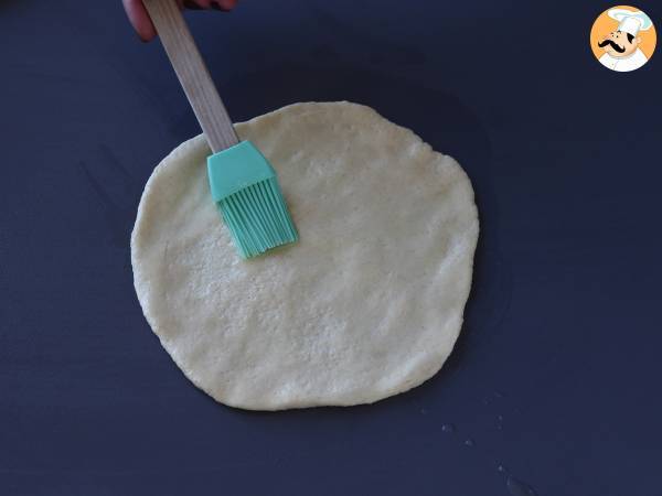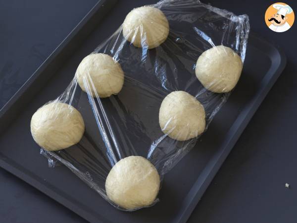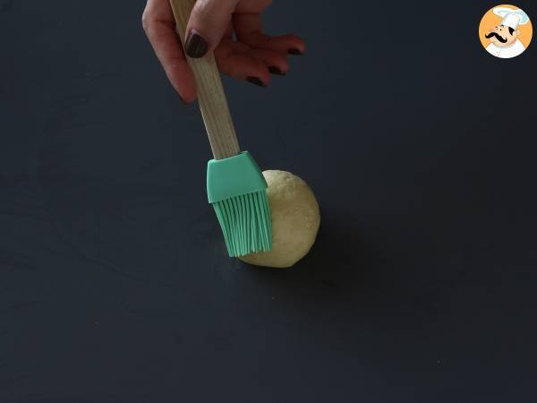 Se unge aluatul (bila de aluat), apoi se împarte în 6 părți egale (aproximativ 110 gr). Din bucățile de aluat tăiate se formează bile pe care le ungem înainte de a le așeza pe o tavă de copt.