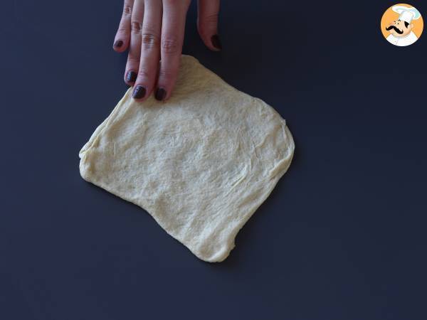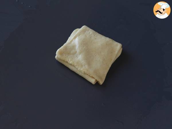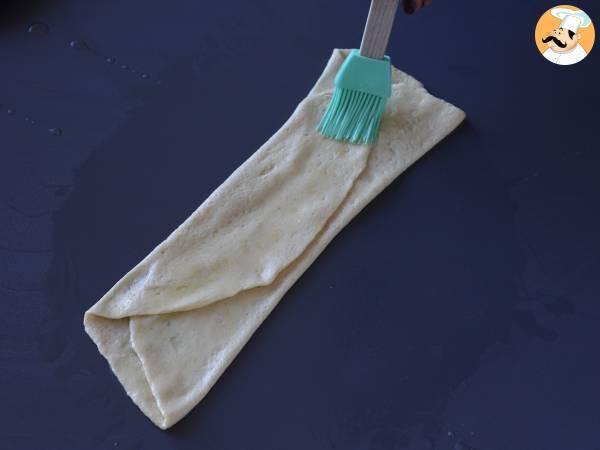 Îndoiți apoi partea de sus al aluatului spre centru, ungeți și la final pliați partea de jos a aluatului, deasupra pentru a forma un pătrat. Ungeți pentru ultima oară.
