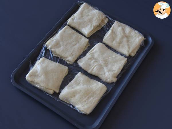 Așezați pătratele pe o foaie de copt și acoperiți cu folie alimentară. Se lasă să se odihnească aproximativ 15 minute.