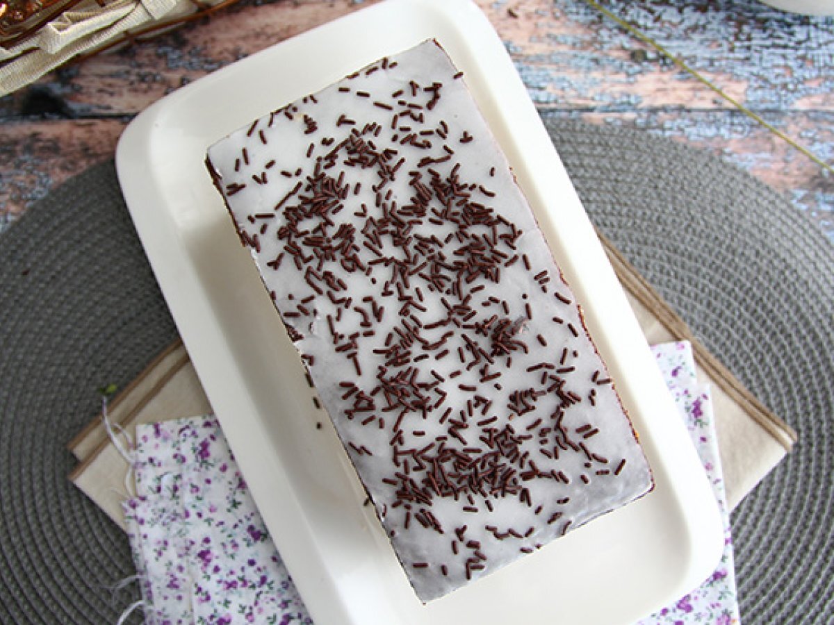 Puneti o jumatate din baltul de vanilie pe platoul de servire, apoi adaugati ganache de ciocolata. Puneti peste el un blat de ciocolata si acoperiti din nou cu ganache.