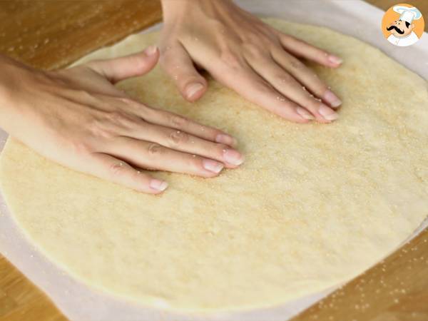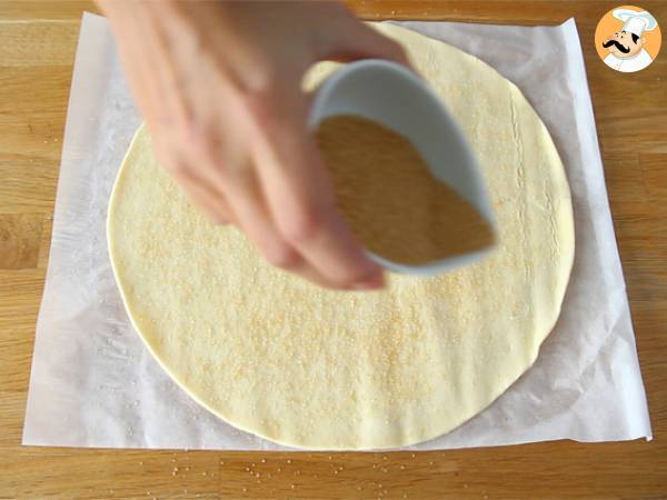 Desfaceti aluatul de foietaj. Presarati jumatate din cantitatea de zahar pe el. Apasati cu mainile ca zaharul sa se lipeasca bine.