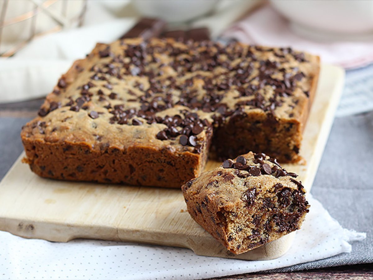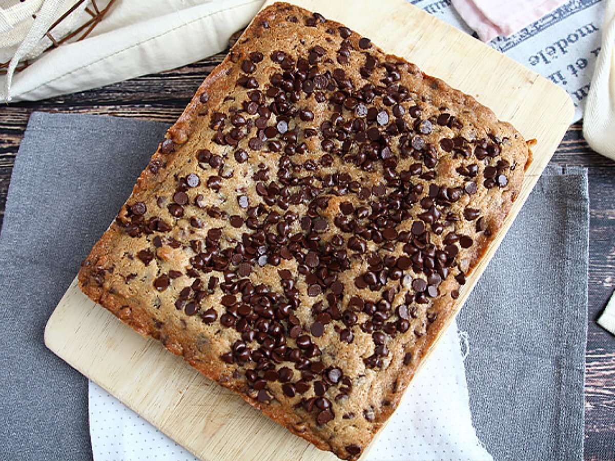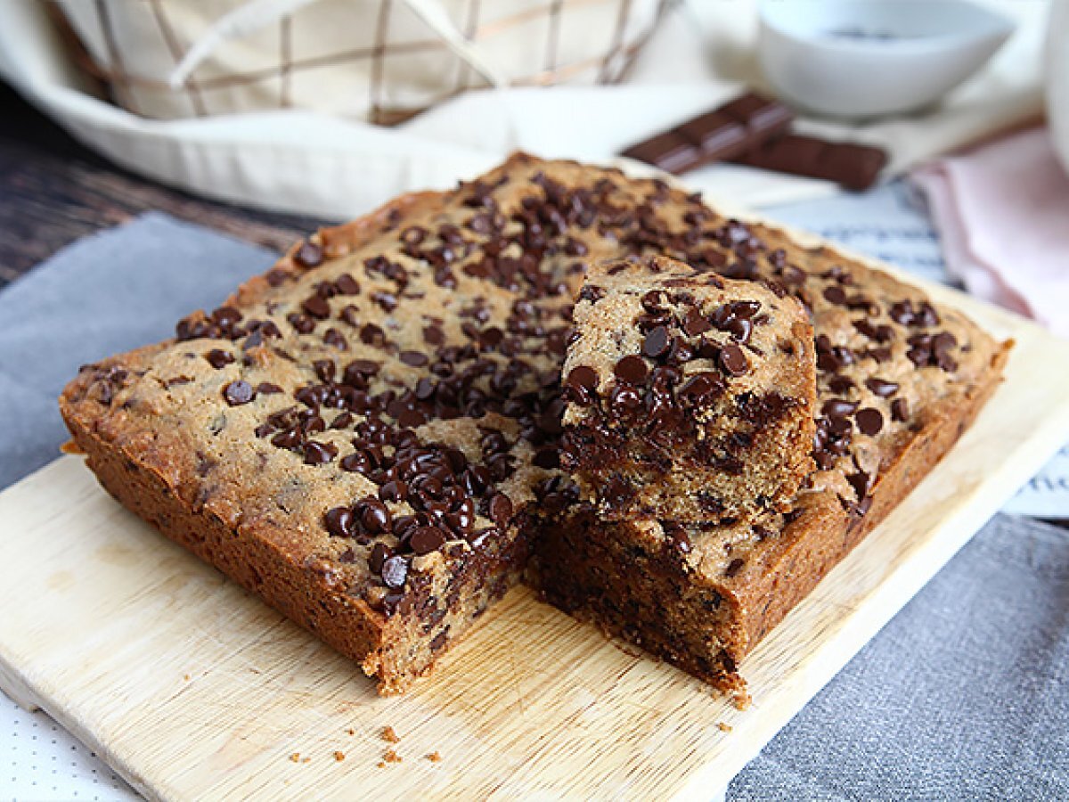 Turnati aluatul intr-o tava tapetata cu hartie de copt si unsa. Adaugati restul de 50g de pepite deasupra.
