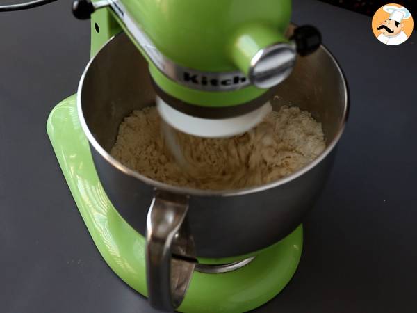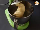Se încorporează ouăle 1 câte 1 apoi se adaugă puțin câte puțin untul înmuiat. Când tot untul este încorporat, frământăm aluatul pentru aproximativ 10 minute.