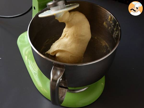 Amestecați drojdia uscată cu laptele călduț. Lăsați sa se odihnească 10 minute înainte de utilizare. Se toarnă amestecul în vasul mixerului și se adaugă făina, zahărul și sarea. Se frământă pentru a amesteca toate ingredientele.