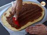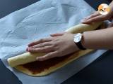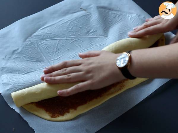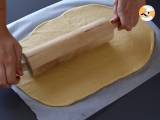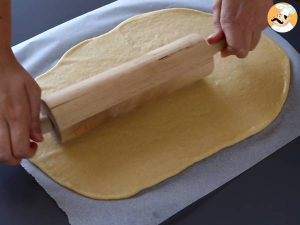 Întindeți aluatul peste hârtia de copt folosind sucitorul, astfel încât sa fie de aproximativ 30x40 cm.