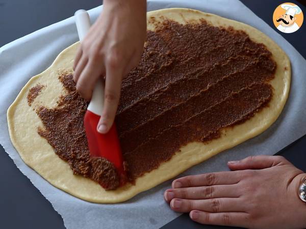 Lăsăm aluatul să se odihnească 2 ore la temperatura camerei. Așezați hârtie de pergament pe suprafața de lucru. Amestecați untul înmuiat cu zahărul brun și scorțișoara.