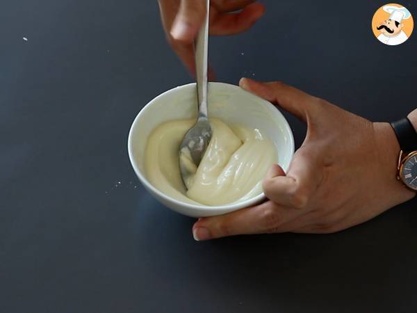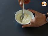 Amestecați crema de brânză și zaharul pudră și adăugați laptele puțin cate puțin în timp ce amestecați. Adăugați extractul de vanilie și amestecați din nou.