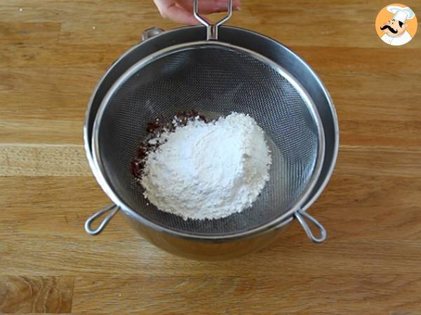Adaugati cacaoa cernuta, faina si praful de copt, apoi adaugati sarea si incorporati totul folosind o spatula.