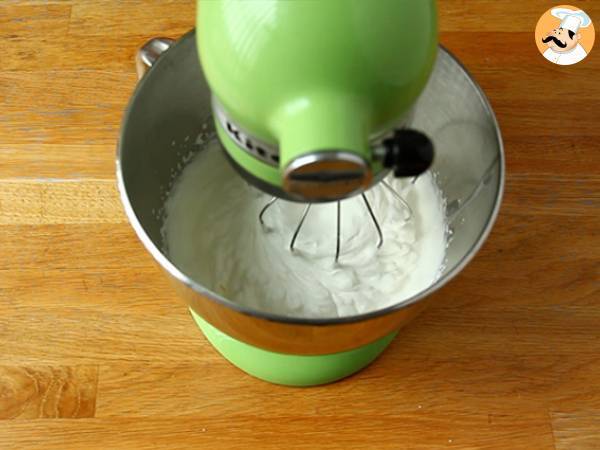 In vasul mixerului, bateti ouale, vanilia si zaharul, pana la dublarea volumului.