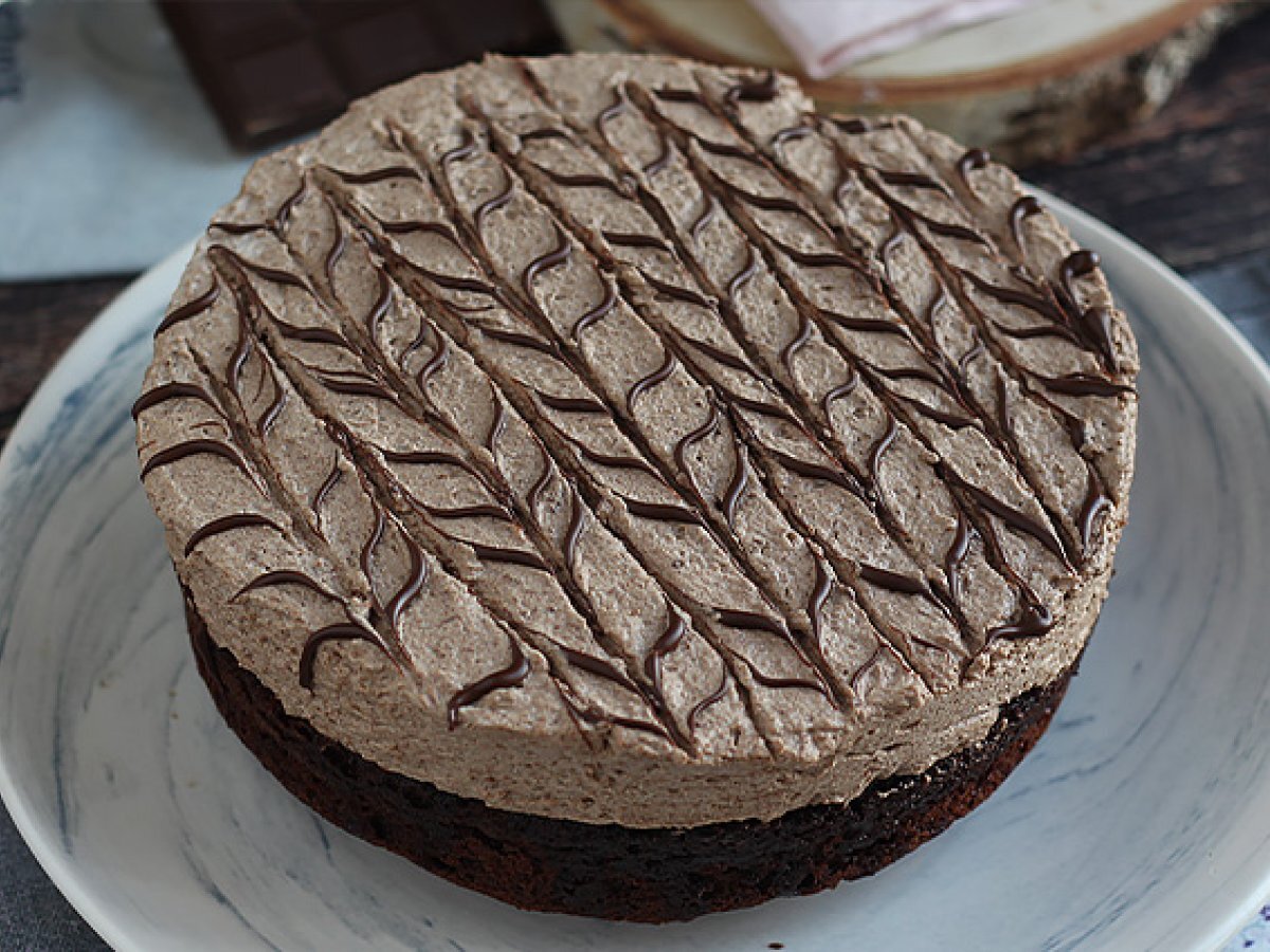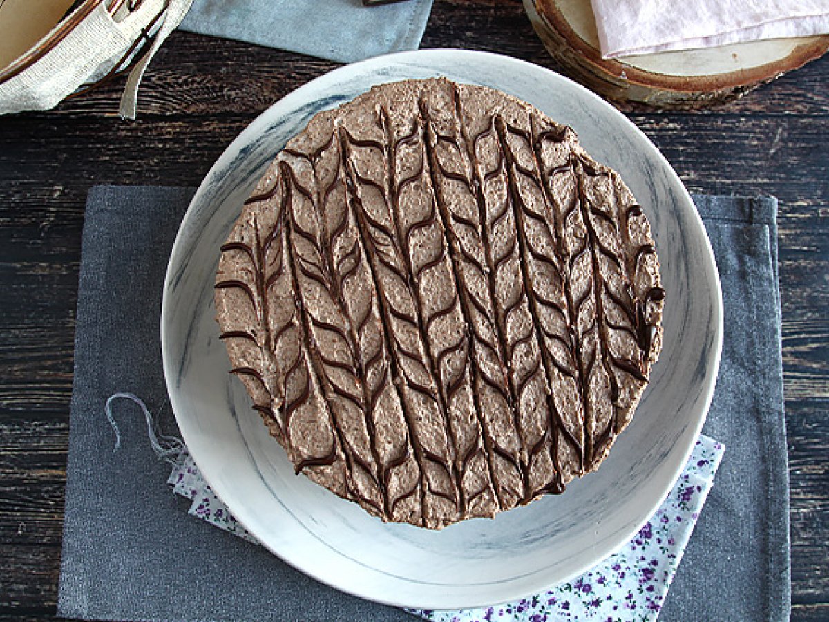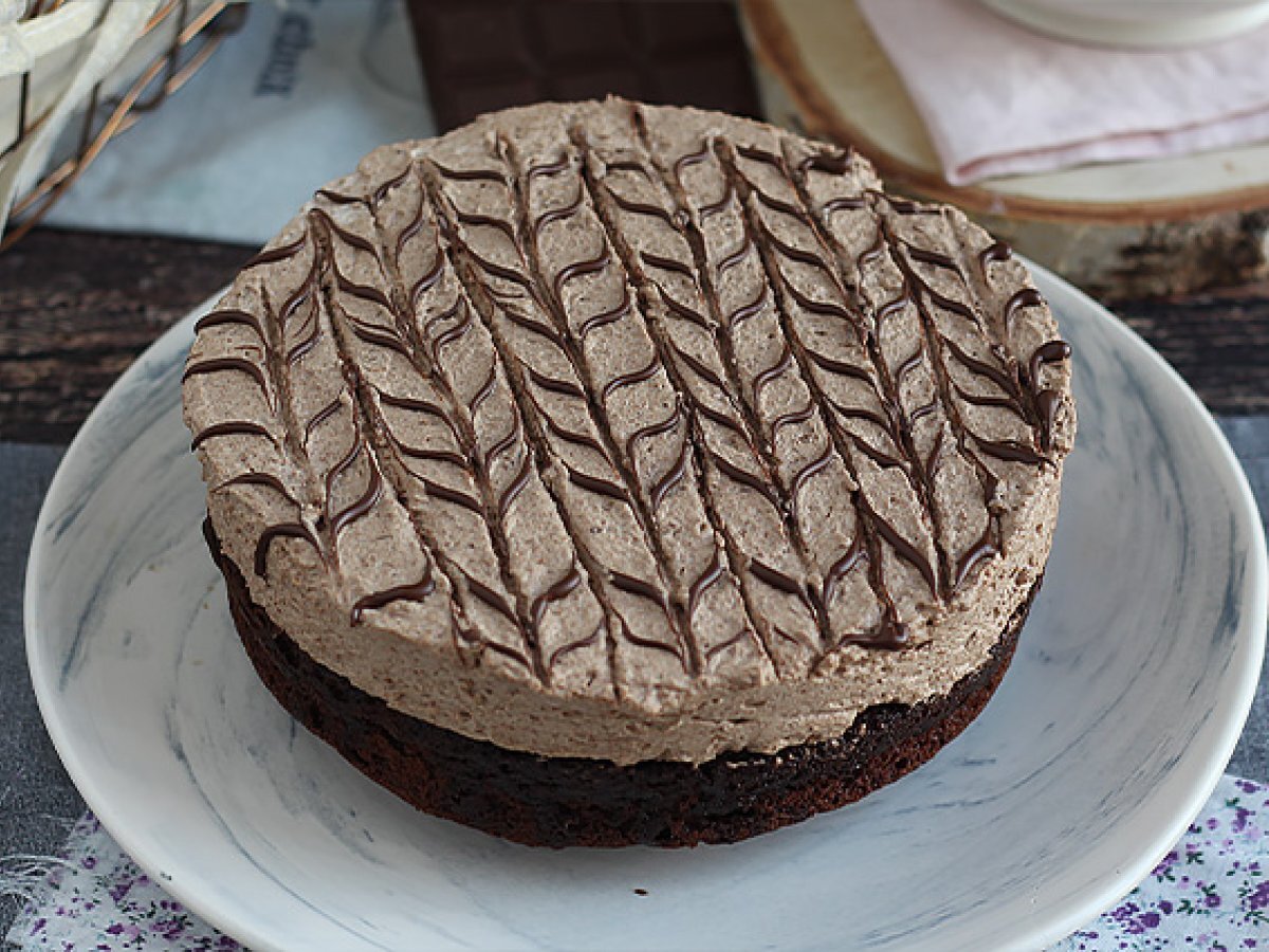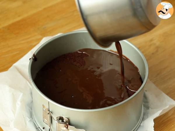 Asezati o folie de acetat in jurul tortului inainte de a pune spuma, apoi acoperiti cu mousse de ciocolata. Neteziti bine partea superioara si raciti timp de 30 de minute.