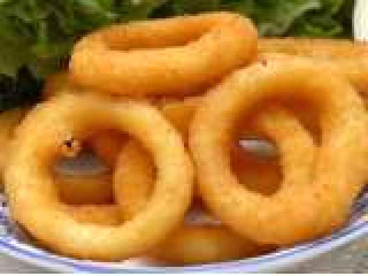 Separam inelele de ceapa. Scufundam cate unul într-o cantitate mic? de lapte, timp de 10 de minute, apoi se cufunda în aluat. Le pr?jim in mai mult ulei fierbinte pe ambele parti, pana se fac aurii, usor spre brun.
