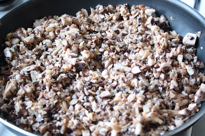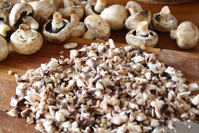 Intai si intai am spalat bine, bine ciupercile. Apoi am tocat marunt de tot o ceapasi un catel de usturoisi le-am calit in 50g de unt, 5 minute. Am adaugat in tigaie 250g de ciuperci maruntite bine, sare&piper si am lasat 10 minute pe foc, pana scade tot lichidul.