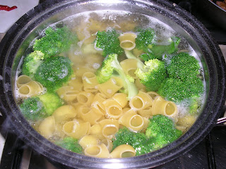 Preparazione: Lavare i broccoli, dividere le cimette in 2-3 cime ciascuna ed eliminare il gambo se stopposo (altrimenti tagliarlo a piccoli tocchetti); far bollire in una padella abbondante acqua salata e immergervi le cimette del broccolo. Dopo 5 minuti unire le pipe e cuocere fino a quando la pasta sarà cotta al dente.