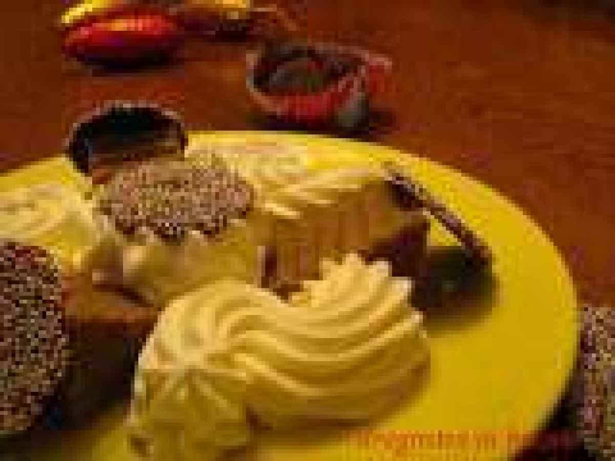 Se monteaza pe farfurie impreuna cu "S'-urile de frisca (pe care le-am facut cu posul) ... si se orneaza cu banuti de ciocolata cu perlute.