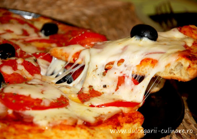 Am primit ieri o comanda speciala, pentru un botez de libelule... PIZZAAA !! Si cu gandul asta am zburat de la servici spre casa. Am trecut pe la market sa iau niste rosii, un ardei verde si am sarit repede-n coca, cand am ajuns acasa.... Ardeiul l-am uitat in frigider cand m-am apucat de pizza, am si eu o varsta :))... asa ca n-o sa-si faca simtita prezenta in reteta asta...