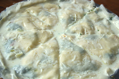 Acum - asamblarea: am uns forma de tarta cu unt, si am acoperit-o cu vreo 4 foi de placinta(ungand fiecare foaie cu unt topit). Peste am presarat jumate din dovleac, jumate din spanac si jumate din branza. Am acoperit cu inca 4 foi de placinta (again, am uns-o pe fiecare in parte cu unt), si deasupra celelate jumatati de dovleac/spanac/branza + inca 4 foi de placinta.