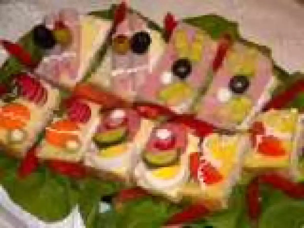 Asadar pentru sandvisuri am folosit paine, crema de branza Fagaras, sunca de Praga, salam sasesc de la CrisTim, ou fiert, ardei rosu, masline, branza topita Hochland felii, cascaval, rosii, castraveti, salata verde, salata de icre, felii de morcov, ridichi, patrunjel verde.